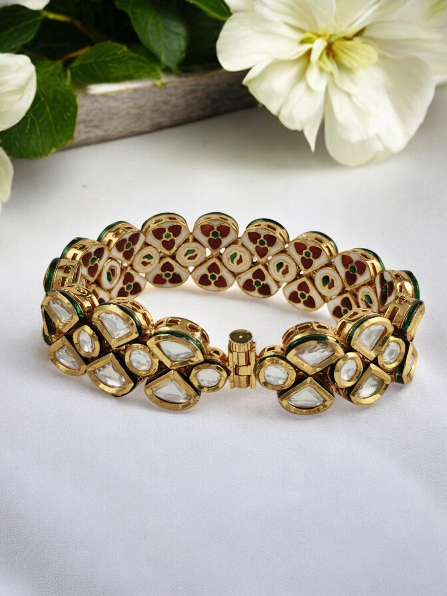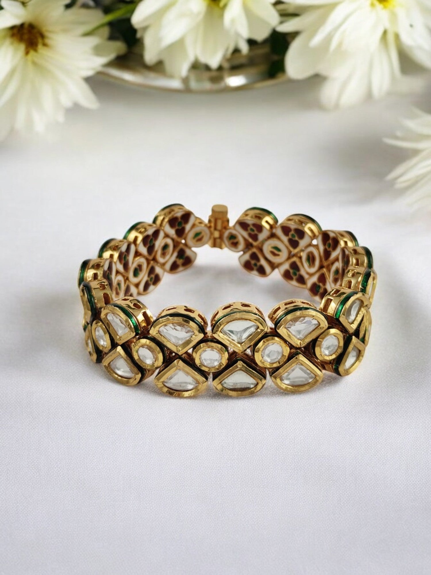 Base Metal: Mix Metal (Copper, Brass & Silver) Indian Size : 2.8-2.10 (6.5-6.8 cm) Weight : 60 gms Stone Setting: Kundan Finish: Gold Sales Package: Single Bracelet Occasions: Weddings, festivals, traditional events. Care Instructions: Wipe with a soft cloth after use, store in a jewellery box, and avoid direct contact with water and perfumes. "The product image may differ slightly from the actual item."